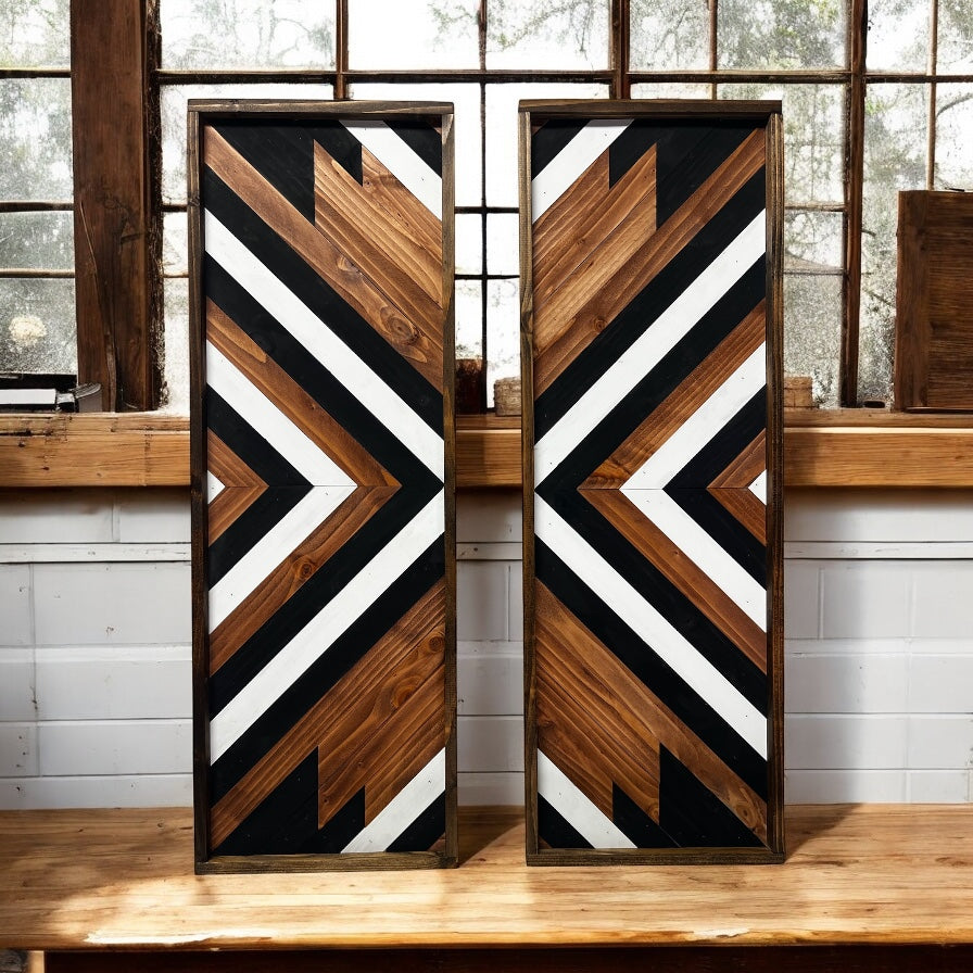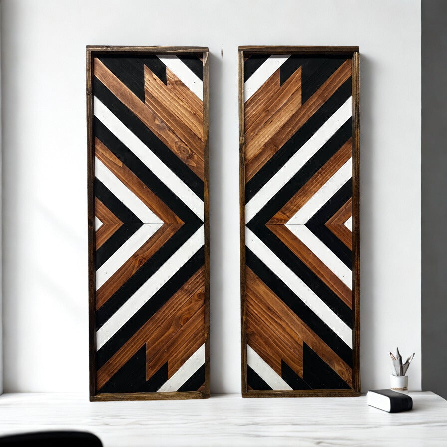 Unleash modern style with The “Twins”. These striking wood panels feature a dynamic black, white, and natural wood geometric pattern. Perfect for adding an instant touch of contemporary design and visual interest to any room. Sold as a set.